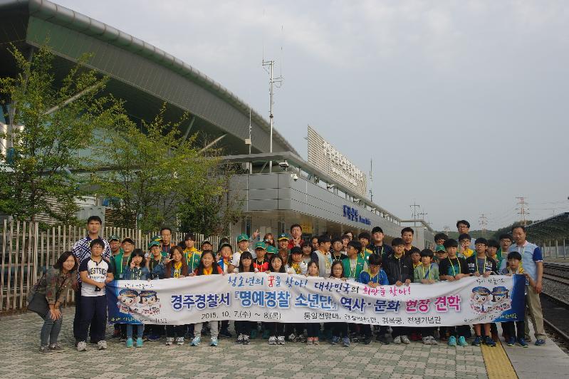 지난 10. 7~8(1박2일) 경주지역 6개 초등학교 명예경찰소년단 60명과 함께 역사·문화현장 견학을 실시하였다. 이번 견학은 통일전망대, 도라산역, 제3땅굴, 경찰박물관, 경복궁, 용산전쟁기념관 등 분단의 현장과 역사·문화 체험을 통하여 명예경찰소년단에게 광복 70주년인 올해 올바른 국가관과 안보의식을 고취시키는 계기를 마련하기 위하여 이뤄졌다. 용황초 류○○은 “이번 견학을 통하여 통일전망대 너머로 보이는 북한 땅을 바라보며 분단의 현실을 새삼 실감하고 많은 것을 느꼈다.”고 소감을 말하였다. 경주경찰서 명예경찰소년단은 2000년 제1기를 시작으로 학교폭력 또래지킴이로서 자긍심과 올바른 국가관으로 나라사랑 정신을 심어주기 위해 안보·역사 현장 견학 및 국토순례 행사를 매년 실시하고 있다. 특히, 현장 견학 일정 사진을 동영상으로 편집, 웹하드와 밴드에 올려 학생들과 학부모들이 바로 볼 수 있고 다운로드 받아 추억으로 간직할 수 있게 하여 좋은 호응을 받고 있다.// 김희철 기자