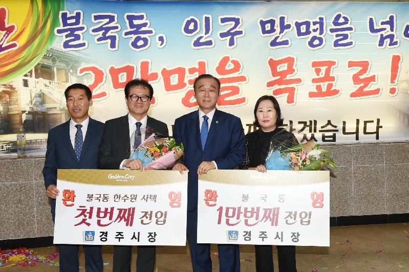 경주시 불국동 인구가 1만명을 넘어섰다. 지난 1998년 정래동, 불국동, 도동동(평동) 일부가 불국동으로 통합된 후 처음으로 인구 1만명을 돌파했다. 불국동은 1998년 통합 당시 9,290명에서 지난해 말 9,143명까지 소폭으로 인구감소가 이어졌으나, 지난 6월 준공된 진현동 두산위브아파트 입주를 시작으로 인구가 증가하기 시작해 지난 9월 4일을 기점으로 드디어 1만명을 넘어섰다. 이에 경주시는 12일 불국동주민센터에서 최양식 경주시장, 지역 시의원, 통장협의회를 비롯한 지역 기관사회단체장과 주민 100여명이 참석한 가운데 불국동 인구 1만명 달성 축하행사를 가졌다. 이날 축하 행사에서는 포항시 북구에서 전입해 1만 번째 불국동 주민이 된 김원년씨(48세, 포항현대제철)와 뒤산위브아파트 첫 번째 전입 세대인 백훈씨(58세, 한수원)를 초청해 축하꽃다발과 기념선물을 전달했다. 특히 불국사에서도 두 사람에게 가정의 다복과 소원성취를 의미하는 불국사 극락전 황금 복돼지 모형을 축하의 선물로 보내와 훈훈한 감동을 더했다. 1만번째 전입의 주인공인 김원년씨는 “직장이 포항에 있어 출퇴근 시간은 조금 걸리지만, 늘 노후에는 불국사 인근에서 전원생활을 할 생각을 갖고 있었다.”며, “뜻하지 않은 행운에 너무 기분이 좋고, 첫 시작이 좋은 만큼 앞으로도 좋은 일만 생길 것 같다”고 말했다. 최양식 시장은 “세계문화유산인 불국사와 석굴암이 있는 불국동은 토함산의 정기를 받은 축복의 땅으로, 주변의 정주 여건 개선이 순조롭게 이뤄지고 있어 향후 전국에서 제일가는 전원생활의 중심지가 될 것으로 기대된다”고 전했다.