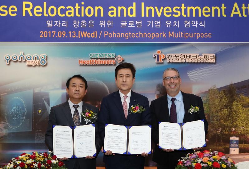 [미디어 타임즈 = 배수남 기자] ㈜지멘스헬스케어가 2020년까지 100억원을 투자해 현재 280명 정도 규모인 포항 사업부 인력을 430여 명으로 확대한다. 포항시는 13일 포항테크노파크 다목적강당에서 포항테크노파크, ㈜지멘스헬스케어와 일자리 창출을 위한 투자유치 업무협약식을 가졌다. 이날 이강덕 포항시장을 비롯해 정해종 포항시의회 부의장, 김기홍 포항테크노파크 원장, 지멘스 Gast Randy 미국 초음파사업부 생산총괄, Horn Christian 동아시아 자산관리 총괄, 박수만 한국 부사장 등 100여 명이 참석했다.