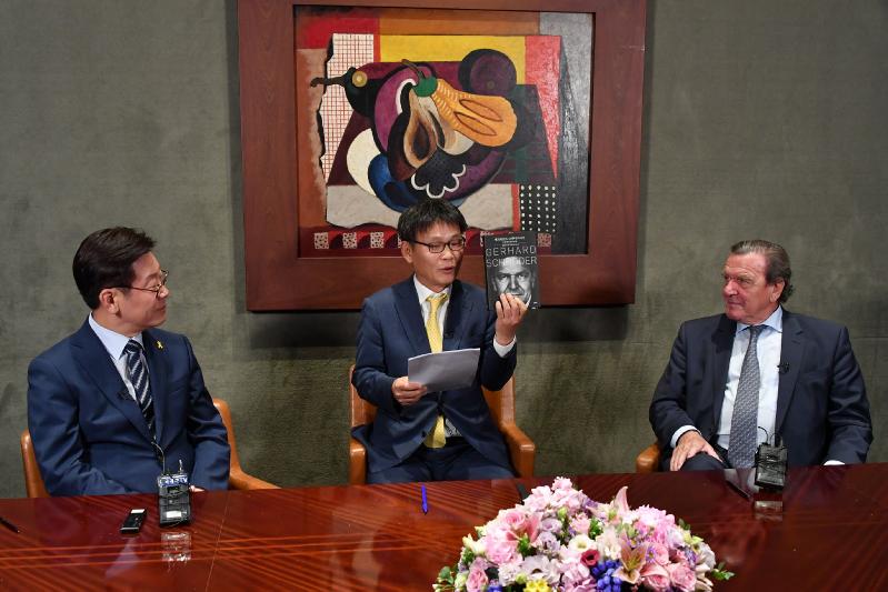 슈뢰더 전 총리는 자서전의 한국어 출간을 기념하기 위해 방한한 뒤 11일 정세균 국회의장, 12일 문재인 대통령과 이재명 시장을 잇따라 만났다.