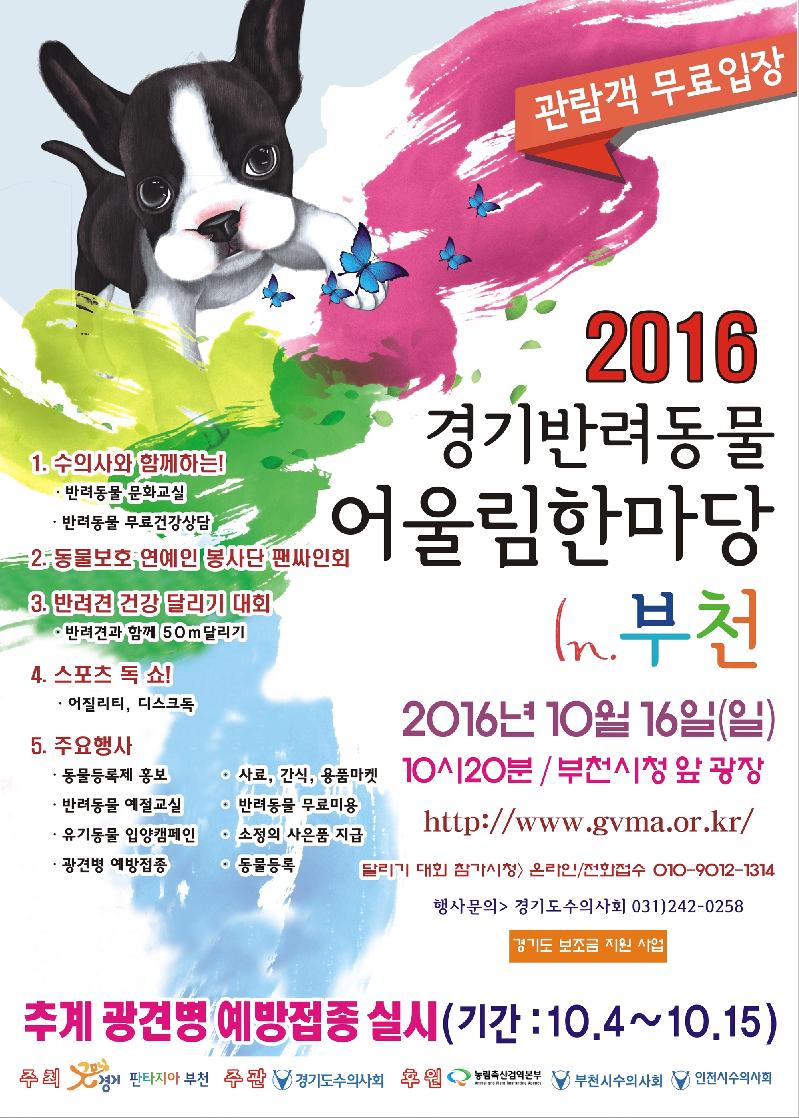 [미디어타임즈= 이영희 기자] 반려동물과 함께 즐거운 추억을 만들 수 있는 ‘2016 경기반려동물 어울림한마당’이 오는 16일 부천시청 앞 잔디광장에서 펼쳐진다.