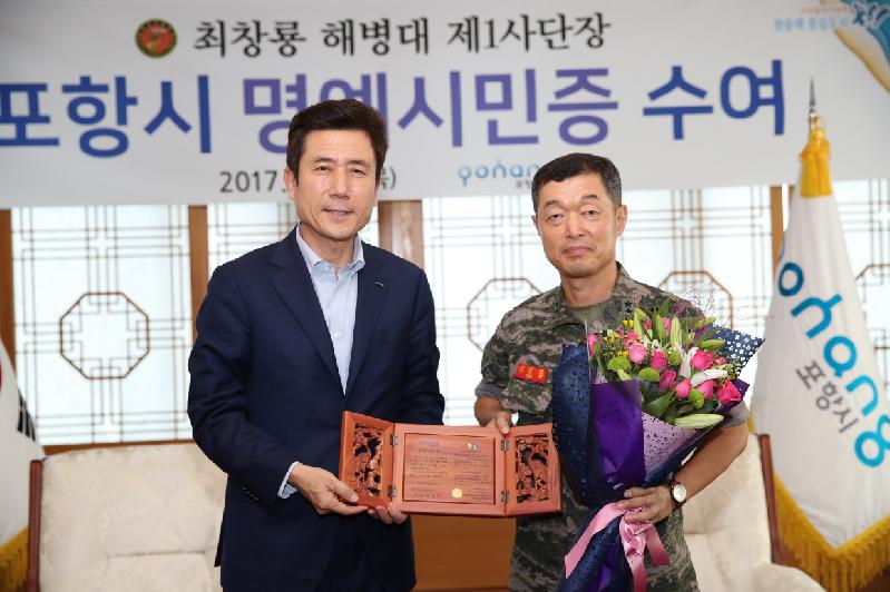 포항시는 14일, 시청 대외협력실에서 지역 통합방위태세 확립과 대민 봉사활동 활성화로 시정 발전에 큰 도움을 준 해병대 제1사단장 최창룡 소장에게 포항시 명예시민증을 수여했다. 최창룡 소장은 지난 2015년 4월 해병대 제1사단장으로 취임한 이후, 통합방위작전계획 수립과 실질적인 훈련을 통해 지역 통합방위태세 확립에 많은 노력을 기울였으며, 포항시 통합관제센터 CCTV 영상정보를 제공받을 수 있도록 시와 정보공유 업무협약을 체결하는 등 지역안보 안정에 크게 기여해 왔다. 또한 봄·가을철 연 16,000여명 규모의 농촌 일손돕기 및 동해안 일대 환경정화활동을 정기적으로 실시했으며, 각종 재난발생 시 장비와 병력을 적극 지원하는 등 지역 주민들에게 사랑받는 해병대를 만드는데 많은 역할을 했다. 이 날 명예시민증을 수여한 이강덕 포항시장은 “지역주민과 소통하고 지역발전을 위해 적극 협조해주신 최창룡 소장께 깊은 감사를 드린다.”면서 “앞으로 포항시가 최창룡 소장님의 제2의 고향이 될 수 있도록 지원과 관심을 아끼지 않겠다.”고 말했다. 이에 최창룡 소장은 “지난 2년간 포항에서 일하면서 각별한 애정을 갖게 됐다.”면서 “해병대의 본고장 포항의 명예시민이 됐다는 것을 매우 영광스럽게 생각하며, 어디에 있든지 포항을 홍보하는데 앞장서겠다.”고 약속했다.