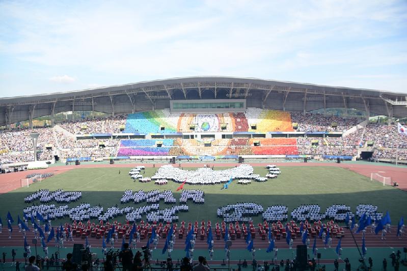 평화의 북소리와 함께 시작한 행사는 화려한 입장식과 2016년 3월 14일 공표한 ‘지구촌 전쟁종식 평화’ 선언문의 10조 38항을 통해 지구촌의 평화를 이뤄가는 모습을 표현한 다채로운 퍼레이드와 카드섹션 등의 공연으로 진행됐다.