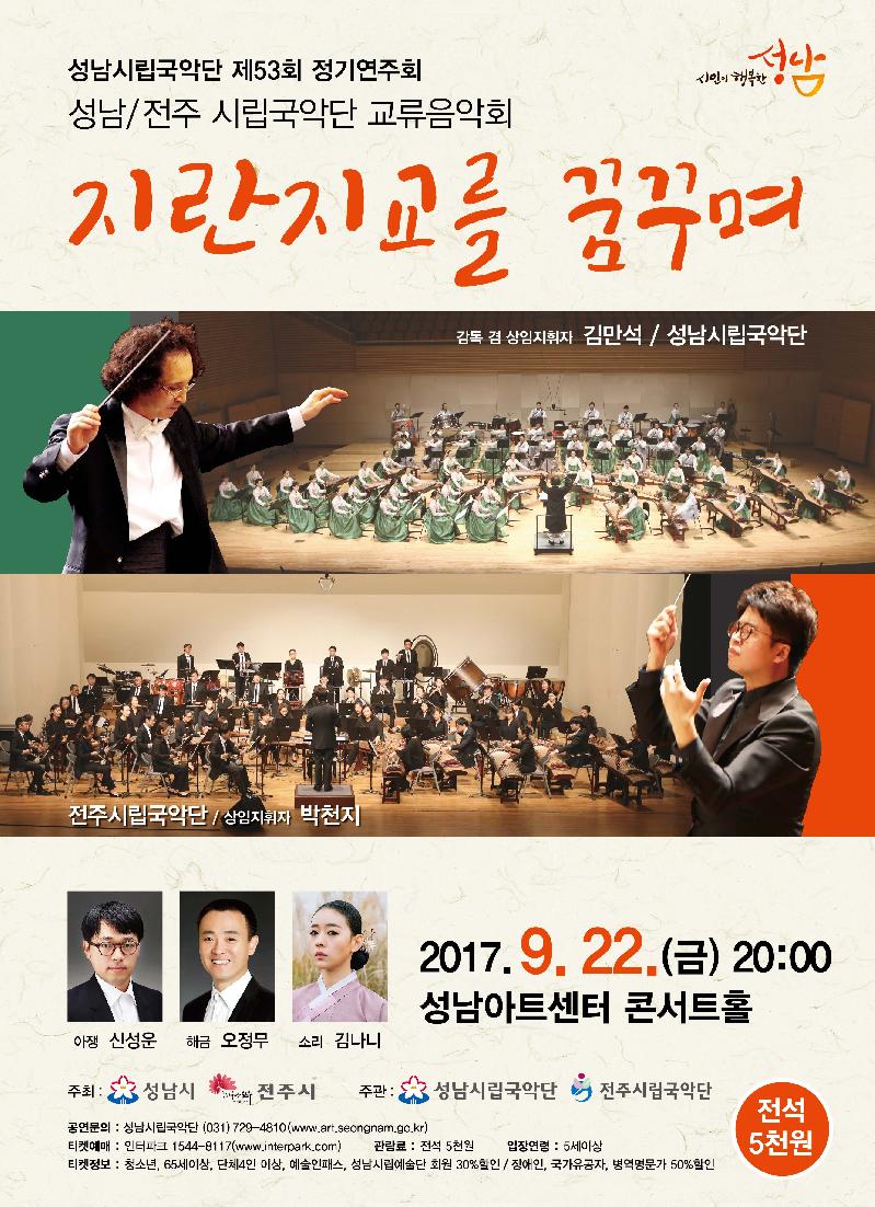 성남시립국악단은 돌아오는 오는 22일(금) 오후 8시부터 성남아트센터 콘서트홀에서 성남시립국악단과 전주시립국악단 교류음악회 제53회 정기연주회 ‘지란지교를 꿈꾸며’ 공연이 펼쳐진다.