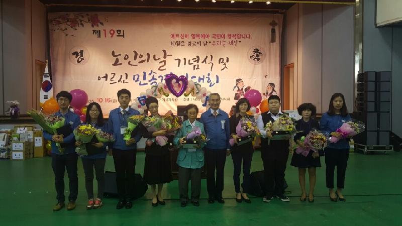 이 날 기념식에서는 시정발전과 노인복지 증진에 기여한 공무원 및 어르신등 16명에게 표창패(장)를 전달하였고, 특히 치매 어머니를 오랫동안 지극 정성으로 모신 고현동에 이명숙씨가 효자효부상을 받아 행사장 분위기를 훈훈하게 하였다.