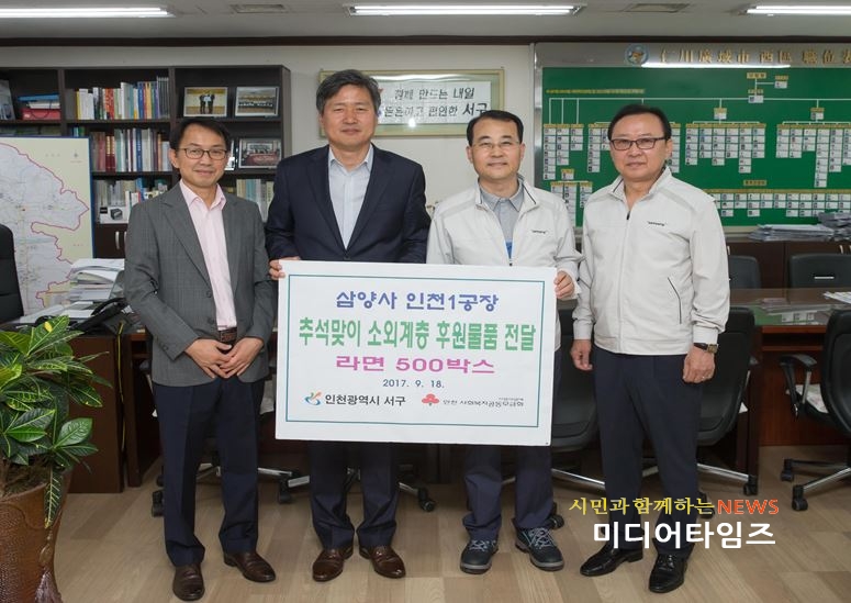 [미디어타임즈=홍기연 기자] 인천 서구(구청장 강범석)는 추석을 맞이하여 삼양사 인천1공장에서 저소득 가구를 위한 라면 500박스(400만원)를 전달했다고 18일 밝혔다.