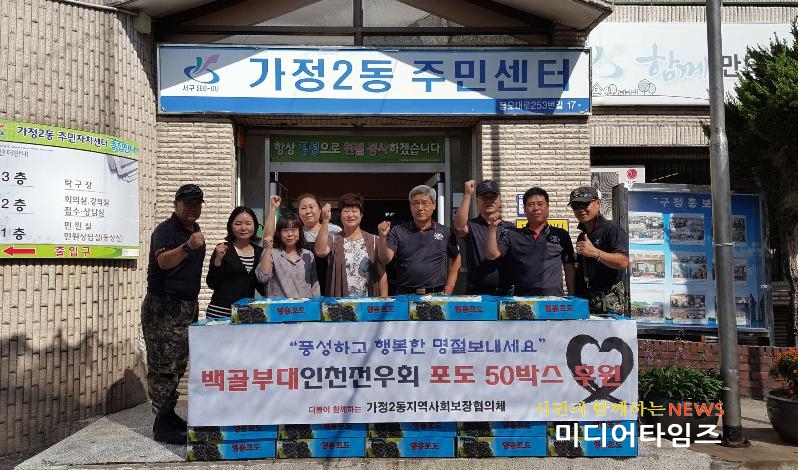 [미디어타임즈=홍기연 기자] 대한민국백골부대인천전우회(회장 이상은)는 지난 18일 추석명절을 맞이하여 포도 50박스를 가정2동 지역사회보장협의체에 전달했다.