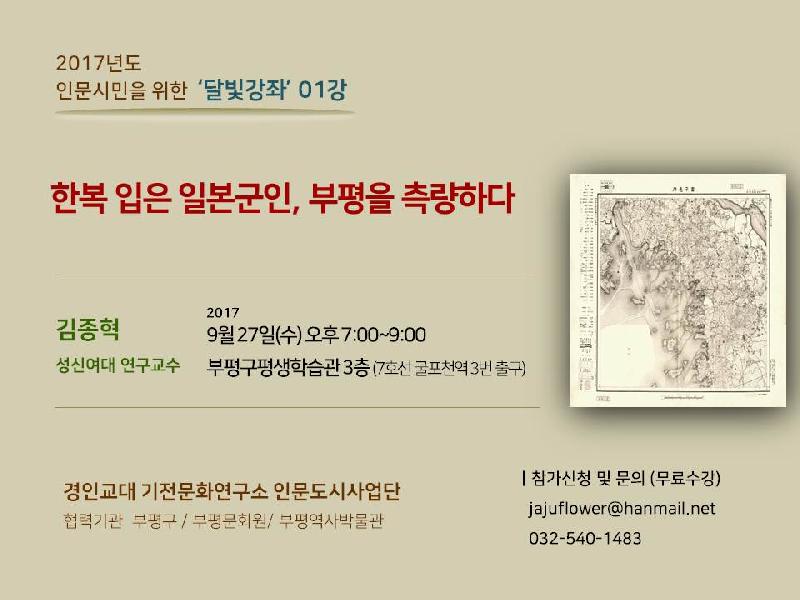 [미디어타임즈=문상수 기자] 인천 부평구(구청장 홍미영)와 경인교육대학교가 인문도시사업 첫 행사로 오는 27일 부평구평생학습관에서 김종혁 성신여대 연구교수를 초청, ‘한복 입은 일본군인, 부평을 측량하다’란 제목의 ‘인문시민을 위한 달빛강좌’를 연다.부평구와 경인교대는 지난해 10월 ‘지역발전을 위한 업무협약’을 맺고, ▲인문도시 조성을 위한 제반 사항의 상호 협력 ▲문화예술행사 및 체육행사 활성화 도모 ▲지역사회 발전을 위한 우수프로그램 및 우수인적자원 상호 교류 및 지원 ▲지역교육발전에 기여할 수 있는 학생 교육프로그램 추진 등을 약속한 바 있다.이번 ‘달빛강좌’는 옛 부평의 치소(治所․행정 사무를 맡아보는 기관이 있는 곳)를 중심으로 분포하는 역사 및 문화 자산을 발굴, 시민들에게 알리고 공유함으로써 부평 지역의 문화적 정체성과 자긍심을 찾기 위해 마련했다.모두 10강좌로 구성된 달빛강좌는 내년 6월까지 1년간 ‘풍수로 부평을 읽다’, ‘부평의 옛길’ 등을 주제로 매월 마지막 주 수요일 오후 7시부터 9시까지 부평구평생학습관 강의실에서 진행한다.부평을 주제로, 전문 강사진의 강연을 통해 주민들이 평소 쉽게 접하지 못했던 부평의 문화와 역사에 대한 이야기를 들을 수 있다.경인교대 기전문화연구소 인문도시사업단 전종한 단장은 “인문도시사업을 통해 현재 시공간적으로 단절된 부평구와 계양구 지역을 아우른 지역 정체성을 재발견하고 부평의 옛 풍경과 지역문화의 흔적을 살피는 가운데 ‘미래부평’을 선도하는 문화적 자긍심을 지닌 인문시민의 길을 가도록 지원하고자 한다”고 밝혔다.‘2017년도 인문시민을 위한 달빛강좌’는 “부평의 ‘인문시민’ : 시공간의 단절을 딛고 부평의 미래와 소통하다”라는 주제로 경인교대 기전문화연구소가 한국연구재단으로부터 3년간 국비 지원을 받아 여는 것으로, 부평구청과 부평문화원, 부평역사박물관이 협력기관으로 참여한다.참가신청 및 자세한 문의는 경인교대 기전문화연구소 인문도시사업단(☎540-1483, jajuflower@hanmail.net)으로 하면 된다.