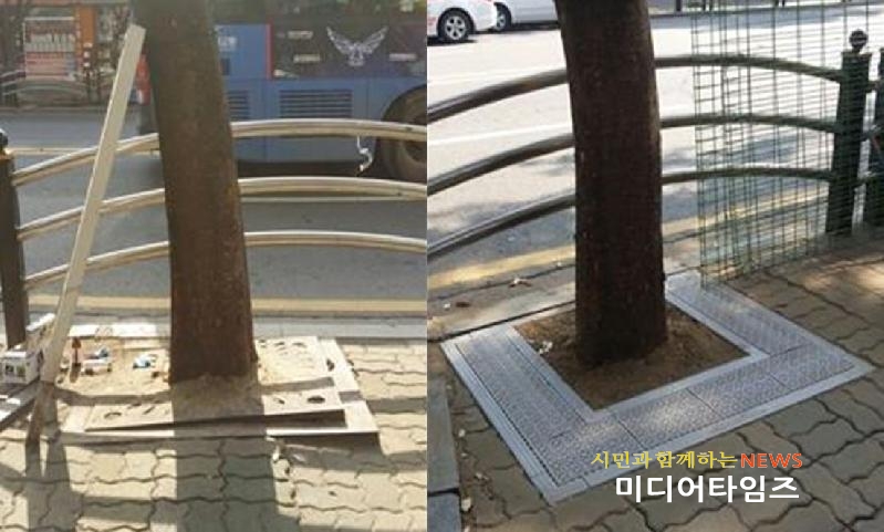 | 가로수보호판 정비 전후 사진.<ⓒ미디어타임즈> |