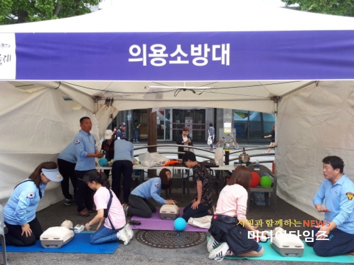 [미디어타임즈=문상수 기자] 인천부평소방서 의용소방대는 지난 23일부터 24일까지 이틀간 열린 제21회 부평풍물대축제장을 찾은 시민들을 대상으로 심폐소생술 보급에 나서 시민들에게 값진 생명존중 의식을 확산시키고 안전의 소중함을 안겨주었다. 이 날 교육은 행사장 체험마당에 마련된 의용소방대 부스에서 부평소방서 의용소방대 7개대가 참여해 행사장 곳곳을 다니며 화재예방 홍보활동과 마네킨을 활용하여 직접 체험해볼 수 있는 심폐소생술 교육 부스를 운영하였다.특히 부평소방서 의용소방대원들은 ‘119수호천사’활동으로 심폐소생술 강사과정 등 전문자격을 취득한 대원들로 구성돼 대형마트, 지하역사 등 지역 곳곳 오랫동안 시민들에게 귀중한 생명을 구하는 심폐소생술 보급에 기여해왔다. 의용소방대 관계자는 “인천시민이 모두 즐기는 부평풍물축제에서 생각보다 많은 시민들이 심폐소생술에 관심을 많이 가져주셔서 알리는 내내 뜻 깊은 시간이었다”며“앞으로도 심폐소생술 교육이 필요한 곳에서 보급에 기여하겠다”고 전했다.