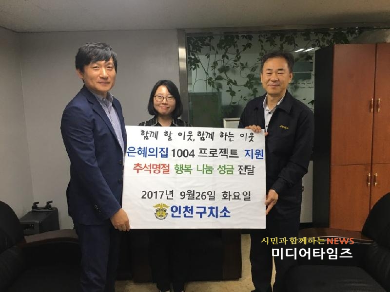 [미디어타임즈=홍기연 기자] 인천구치소(소장 박병용) 보라미봉사단은 추석명절을 맞이하여 26일(화) 오후 2시, 인천 서구 심곡동에 위치한 노숙인재활시설 은혜의집(원장 김현철)을 방문, 지역사회 소외계층을 위한 행복나눔 성금을 전달했다.