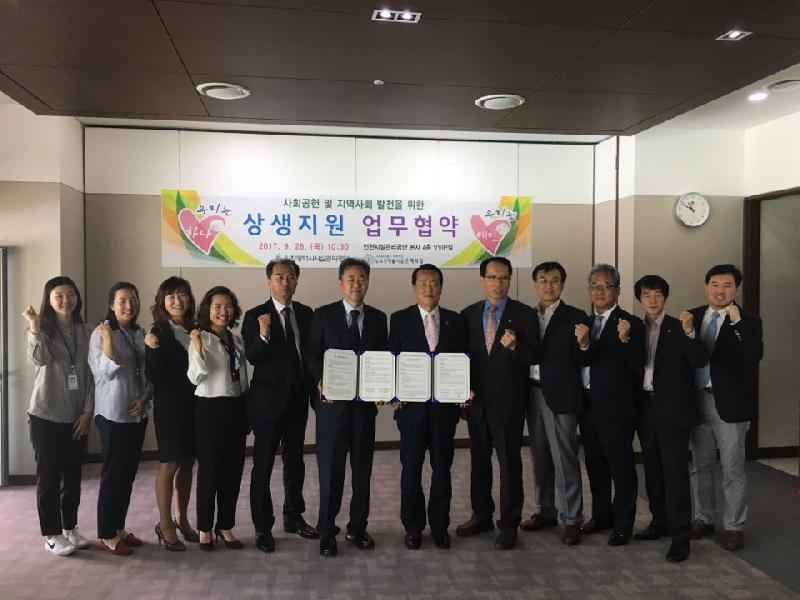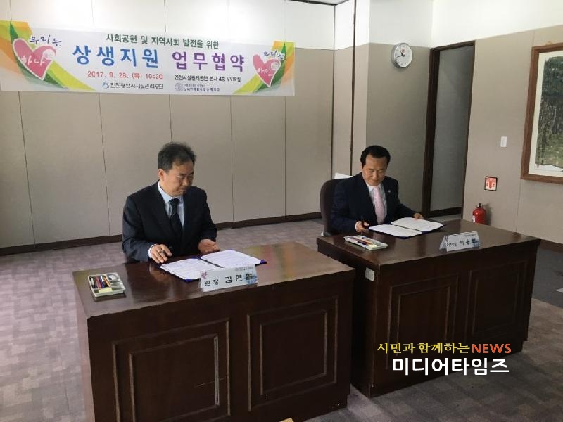 | 인천광역시 시설관리공단-노숙인재활시설 은혜의집 업무 협약 체결 모습.<ⓒ미디어타임즈> |