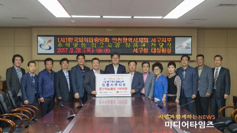 [미디어타임즈=홍기연 기자] 우리 고유의 명절 추석을 맞이하여 (사)한국외식업중앙회 인천광역시지회 서구지부장 조귀정(희래등 대표)은 사무국장 및 운영위원들과 함께 이웃사랑 실천을 위한 성금으로 온누리상품권 일백만원을 서구청에 기탁했다.