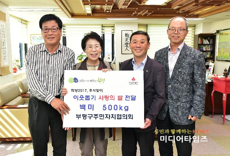 [미디어타임즈=문상수 기자] 인천부평구자치협의회는 지난 28일 부평구청을 방문, 홍미영 부평구청장에게 “소외된 주변 이웃들을 위해 써달라”며 사랑의 쌀 500kg을 전달했다.김용석 부평구자치협의회 회장은 “명절이 되면 평소보다 소외감을 느끼는 어려운 이웃들에게 조금이나마 도움이 됐으면 하는 마음에 쌀을 전달하게 됐다”고 밝혔다. 홍미영 구청장은 “추석을 맞아 주변 이웃들이 희망을 가질 수 있도록 함께해 주셔서 감사하다. 모두가 따뜻한 정을 나누는 즐거운 명절이 되도록 어려운 이웃들에게 귀하게 전달하겠다”고 말했다.