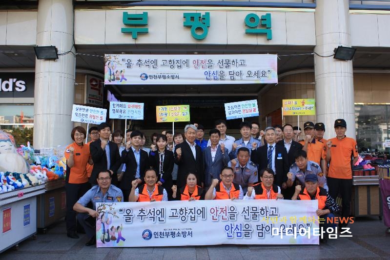 [미디어타임즈=문상수 기자] 인천부평소방서(서장 노경환)는 29일 부평역과 부평역사쇼핑몰 일대에서 귀성객들을 대상으로 고향집 화재예방을 위한 주택용 소방시설 선물하기 홍보 캠페인을 벌였다. 시민들의 고향 대다수는 농·어촌 지역으로 이 지역은 노약자나 고령자의 비율이 높아 화재 발생 시 스스로 대피가 어렵고 소방서가 비교적 원거리에 위치하는 경우가 많다. 또 화재 발생시 스스로 초기대응이 쉽지 않아 인명과 재산에 큰 피해를 겪을 수 있어 초기 대응을 위한 주택용 소방시설 설치가 필수라는 점을 강조하고자 시민들을 대상으로 화재예방 의식고취를 위한 캠페인을 기획하였고 소방, 의용소방대, 지하철 및 역사쇼핑몰 관계자 등 100명이 참여하였다. 소방서는 ‘올 추석에는 고향집에 안전을 선물하고 안심을 담아오세요’라는 슬로건으로 부평역사와 역사쇼핑몰 일대를 돌며 가두 캠페인을 벌였고, 주택용 소방시설 체험판을 활용해 시민들이 소방시설에 대해 정보를 얻고 체험해 볼 수 있는 홍보부스를 운영해 큰 호응을 얻었다.