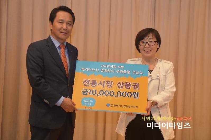 | 28일 오후, 한국마사회 이양호 회장과 광명시노인종합복지관 서은경 관장이 복지관 5층 강당에서 전통시장 상품권 전달식을 갖고 기념촬영을 하고 있다. (사진 좌측부터- 이양호 회장, 서은경 관장) <사진=저작권자 ⓒ미디어타임즈> |