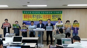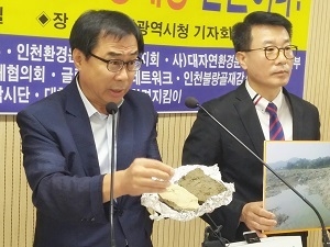 [미디어타임즈=문상수 기자] 불량골재 무기성오니 불법매립 환경재앙 원인이다!글로벌에코넷(상임회장김선홍),인천환경운동연합 서구지회(지회장 이보영),대자연환경운동연합 인천지부(회장 한영일)등 10여개 환경단체 및 시민사회단체들은 지난27일(목) 10시30분 인천시청에서 “인천시 무엇하나 불량골재 관리감독 부실에 따른 안전상실, 시민생명 외면 환경오염 주범“이다 라고 기자회견을 가졌다.기자회견주최측은 요즘 인천 강화, 경기 김포 부산,울산,세종,당진등 전국 각 지역에서 불량골재 및 무기성오니 불법매립으로 인한 다른 환경문제가 부각 되고있어 인천시에 빠른 대책을 요구했다.불법 불량 골재들이 난무하고 있는것에 대하여 관리,감독이 현실에 미치지 못한 의혹이 있고 불량골재로 인한 환경오염 및 문제점을 알리고 어떠한 원인에서 환경오염이 되는지를 파악 하여 건설현장에서 판치는 불량골재가 사라질때까지 환경.시민단체들은 인천시민의 생명과안전을 지키기위한 인천불량골재감시단을 운영하여 철저하게 감시 고발하겠다며 기자회견문을 발표했다.