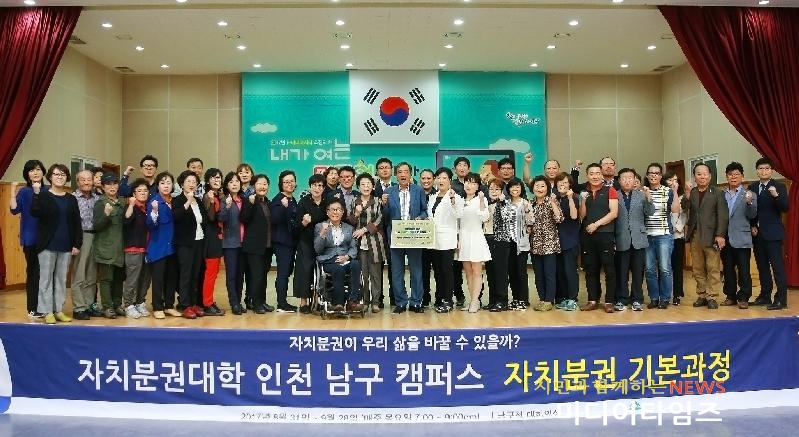 [미디어타임즈=문상수 기자] 인천 남구(구청장 박우섭)가 자치분권대학 남구캠퍼스 5주 과정을 마무리했다.자치분권대학 남구캠퍼스는 ‘자치분권이 우리 삶을 바꿀 수 있을까?’란 주제로 일반주민, 구의원, 공무원 등 60여명을 대상으로 교육했다.교육은 인하대 이기우, 충남대 육동일, 경북대 문장수, 순천향대 장호순, 건국대 이인숙 교수 등 각 분야 전문가들이 강사로 나서 지방자치의 이론적 배경과 현황, 지방분권의 의미와 필요성, 마을단위의 자치분권 사례 등에 대해 강의했다.특히 건국대 이인숙 교수는 ‘주민참여와 마을자치’라는 주제의 마무리 강의를 통해 주민들 자신이 살고 있는 지역의 현안문제에 대한 관심과 참여가 필요함을 강조했다.자치분권대학 남구캠퍼스 학장인 박우섭 남구청장은 “교육에 관심을 갖고 참여해 주신 수료생 여러분의 열의와 열정에 감사드린다”며 “여러분이 진정 우리 시대가 원하는 자치분권의 리더”라고 말했다.한편 남구는 이번 자치분권대학 남구캠퍼스 교육과정을 통해 수료자 47명을 배출했다.구는 내년에도 ‘자치분권 전문과정’, ‘생활자치 특화과정’ 등을 통해 자치분권 리더 역할을 수행할 수 있는 인재를 지속적으로 양성할 계획이다.