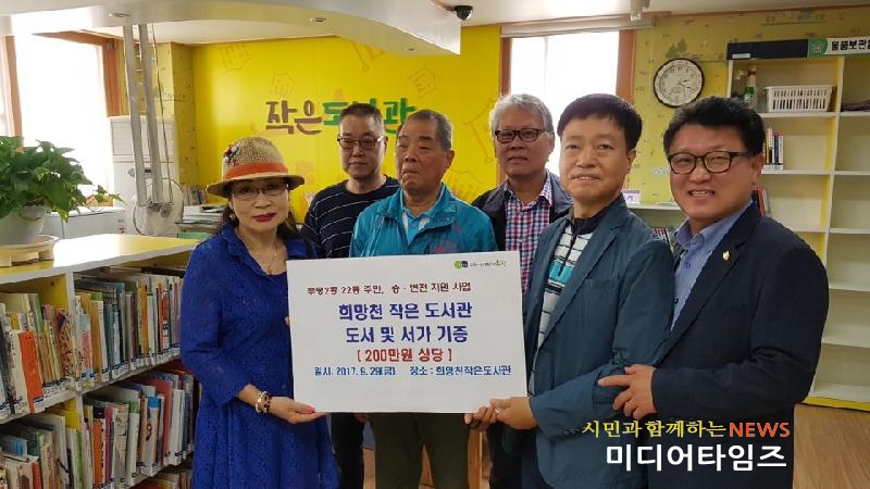 [미디어타임즈=문상수 기자] 인천시 부평구(구청장 홍미영) 부평2동 22통 주민대표들은 최근 ‘희망천 작은도서관’에 200만원 상당의 신간 도서를 기증하는 전달식을 가졌다. 부평2동 22통 주민들은 매년 한전으로부터 지원받은 ‘송·변전 지원금’ 가운데 일부를 활용, 희망천 작은 도서관을 지원하고 있다.주민들은 지난해에 195권 기증에 이어 올해도 약 200만원 상당의 신간 서적(116여권)을 구입, 희망천 작은도서관에 기증한 것이다. 부평2동 희망천 경로당 2층에 위치한 희망천 작은 도서관은 저소득 세대 어린이들이 방과 후에 자연스럽게 들려 책과 함께 할 수 있는 작은 도서관이다.지역주민에게 개방된 이 도서관은 미취학어린이들을 위한 구연동화 프로그램을 상시적으로 진행하고 있다.올해엔 성인들을 위한 프로그램으로 상반기에 독서지도사 과정을 열었으며 하반기에는 10월부터 매주 토요일 8주 과정으로 수납정리사 과정을 운영할 예정이다.