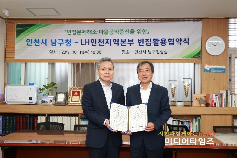 [미디어타임즈=문상수 기자] 인천 남구(구청장 박우섭)는 11일 한국토지주택공사(LH) 인천지역본부와 빈집의 포괄적 활용을 위한 업무협약을 체결했다.이번 협약은 지난해 7월 체결한 ‘주거복지관련 상호협력협약’에서 한 발 더 나아가 거주·사무·공동체 활동·창업 컨텐츠 발굴 및 공동작업 등 마을 공익 증진에 기여할 수 있는 다양한 활동에 빈집을 활용하기 위해 추진됐다.협약에 따라 양 기관은 2017년 10월 현재 LH 인천지역본부가 소유한 39채의 공급 곤란 주택에 대한 포괄적 사용과 추가 발생하는 공급 곤란 주택 및 공공목적으로 공여가 가능한 일반주택에 대한 개별적인 사용협의를 통해 빈집과 마을의 상생을 위한 적극적인 대안 마련에 나서게 된다.특히 구는 올해 행정안전부 마을공방 공모 우수사업으로 선정된 ‘빈집은행’ 사업과 연계, 청년기업들의 마을 취·창업활동의 기반으로 활용할 계획이다.이를 통해 구는 남구지역에서 이탈하고 있는 청년층의 정주비율을 높이고 지속 가능한 마을 형성에 기여할 것으로 기대하고 있다.