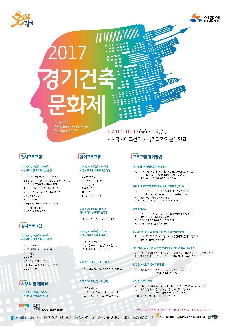 올해 경기건축문화제는 경기도와 시흥시(시장 김윤식)의 공동개최로 추진되며, 전시·체험·교육프로그램 등 다양한 프로그램을 진행한다.