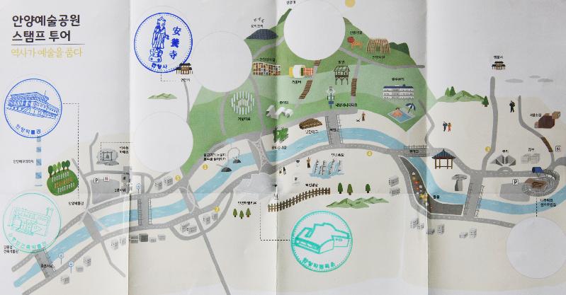 안양예술공원 스탬프 투어는‘역사가 예술을 품다’라는 주제로 총 8개 코스로 구성되어 있다. 안양박물관과 김중업건축박물관, 마애종, 안양사를 둘러보는 역사문화코스와 국내 최초 공공예술박물관인 안양파빌리온과 안양상자집, 전망대, 나무위에 선으로 된 집 안양공공예술프로젝트(APAP) 작품을 감상하는 현대예술 코스로 나뉘어 있다.