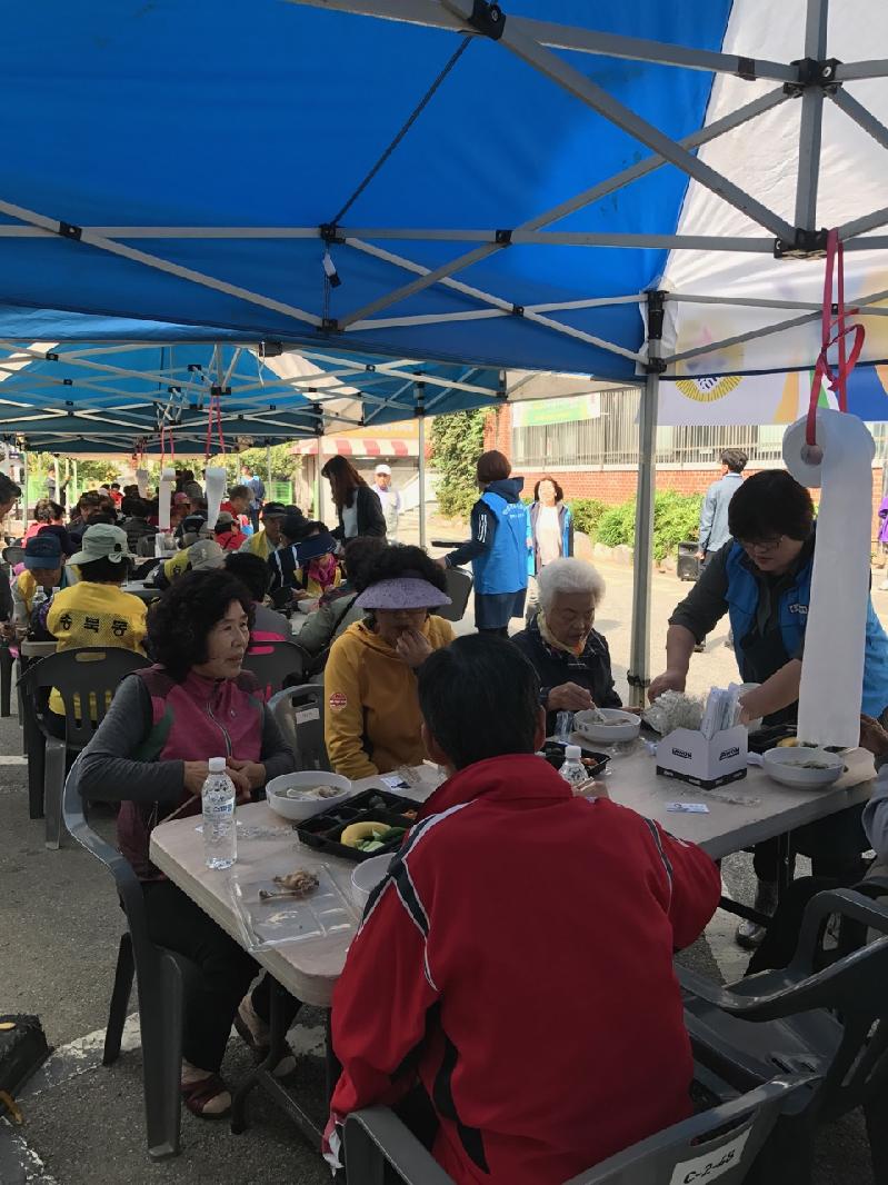 아침 일찍부터 정성스레 육수를 내어 삼계탕을 끓이고, 떡, 과일, 밑반찬 등을 함께 대접하여 어르신들의 건강을 기원했으며, 행사장에서 흘러나오는 흥겨운 풍악소리에 어르신들의 기쁨은 더했다.