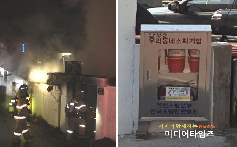 [미디어타임즈=문상수 기자] 인천남부소방서(서장 김성기)는 지난달 29일 밤 10시 58분경 남구 숭의동의 한 단독주택에서 화재가 발생했으나, 인근 주민들이 주변에 설치된 ‘우리동네 소화기’함의 소화기로 신속하게 대응해 큰 화재를 막았다.이웃주민 신씨(여, 64세)가 인근 주택에서 화염이 나오는 것을 목격하고 신고한 화재로 출동한 소방대원의 활동으로 도착한지 20여분 만인 밤 11시 17분경 완전히 진화되었다. 이번 화재는 인명피해 없이 내부 38㎥ 및 냉장고 등 가재도구류 등이 소훼되어 소방서 추산 약 630만원의 재산피해를 냈다. 특히, 이번 화재가 발생한 장소가 주택이 밀집되어 있어 자칫 연소 확대로 인한 대형화재가 우려되는 상황이었다. 이에 소방대원이 도착하기 전 인근 주민들은 주변에 설치된 ‘우리동네 소화기함’에서 소화기 6개를 사용하여 더 이상의 연소가 확대되지 않도록 막는데 크게 기여하였다.한편, 인천남부소방서는 소방차량 진입이 어려워 화재에 취약한 골목길 등에 ‘우리동네 소화기함’을 지속적으로 설치해 지역 주민들 누구나 유사시 사용함으로써 초동 대처를 강화할 수 있도록 교육과 홍보를 진행해 오고 있다.