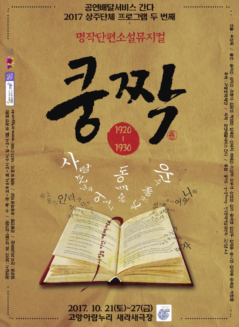 [미디어타임즈= 이옥수 기자] 고양문화재단(이사장 최성, 대표이사 박진)은 10월 21일(토)부터 극단 ‘공연배달서비스 간다’의 명작단편소설뮤지컬 을 고양아람누리 새라새극장에서 진행한다고 밝혔다.