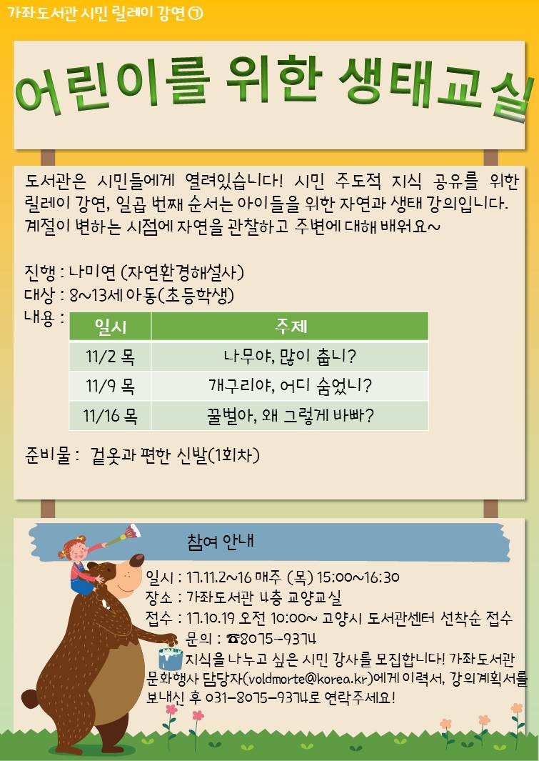 내달 2일에 진행될 첫 번째 강의는 ‘나무야 많이 춥니?’를 주제로 인근 가좌공원을 산책하고 겨울을 준비하는 나무를 살펴본 후 PPT 자료화면을 보며 정리하는 시간을 가질 계획이다. 이어 11월 9일 ‘개구리야! 어디에 숨었니?’와 16일 ‘꿀벌아! 왜 그렇게 바빠?’를 제목으로 강의가 이뤄지며 각각 영상 및 자료 등을 보며 공부한 후 만들기와 감상 등을 진행한다.