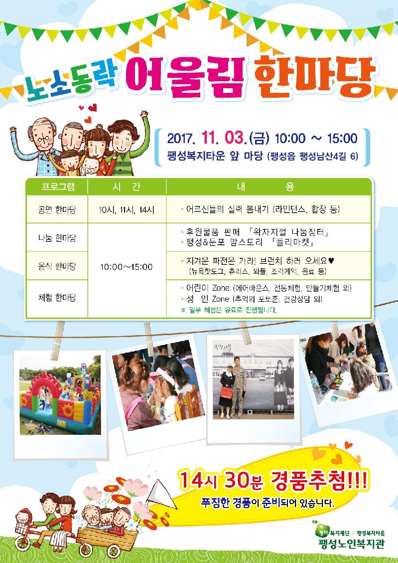 [미디어타임즈= 이옥수 기자] 평택복지재단 산하 팽성노인복지관(관장 김태형)은 11월 3일(금) 10:00~15:00 팽성복지타운 앞 마당에서 '2017 노소동락 어울림 한마당'을 개최한다.