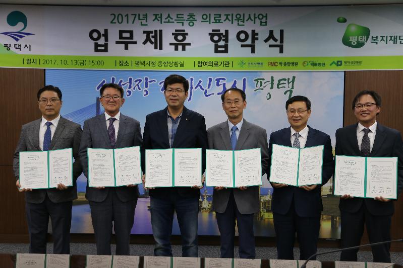 ○ 평택시‧평택복지재단과 4개 지역종합병원(굿모닝병원, 박애병원, 성모병원, PMC박종합병원)은 이번 협약에 따라 저소득층 의료서비스 지원사업과 의료복지사각지대 해소를 위해 상호 협력할 것을 약속했다.