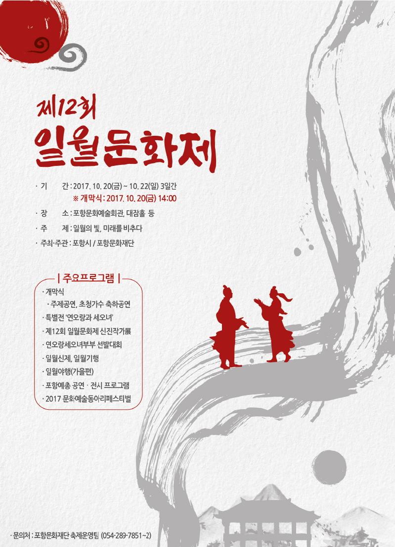 21일에는 문화예술회관 대공연장에서 열리는 주제공연 ‘페인터즈 히어로’에서는 연오랑세오녀 등 다양한 그림을 그리는 넌버벌 퍼포먼스를 선보일 예정이다. 이외에도 창작 국악극 ‘쾌지나 칭칭나네’와 ‘안녕! 강치야’를 비롯해 ‘원소기호 26번 쇠 이야기’, ‘2017 관현악 페스티벌’, ‘2017 문화예술동아리페스티벌’ 등이 관객을 기다리고 있다. 지난 5월 황금연휴에 선보여 큰 호응을 얻었던 야행 프로그램을 한 단계 업그레이드한 ‘일월야행 가을편’은 21일 오후 7시부터 한 시간 동안 연오랑세오녀 테마파크에서 개최된다. 연오랑세오녀 설화와 스틸아트작품을 감상하는 공원 투어와 다도체험과 함께 동해바다의 풍광이 한눈에 들어오는 일월정에서 가야금 선율을 들으며 포항의 역사적 정취를 향유할 수 있다. 어린이를 동반한 가족과 함께 일월지 등 일월 관련 유적지를 전문 해설자와 함께 둘러보며 일월문화의 역사를 직접 보고 느낄 수 있는 ‘일월 기행’은 22일 오전 10시부터 오후 6시까지 열린다. 포항문화재단의 관계자는 “일월문화제는 포항의 문화의 과거, 현재, 미래가 집약되어 있는 종합 문화제로 포항문화재단이 축제의 온고지신 정신을 살려 프로그램을 직접 기획했다.”며 “전통에만 치우친 형식적인 축제가 아닌 전 연령이 즐길 수 있는 축제로 만들기 위해 심혈을 기울였다”고 말했다.