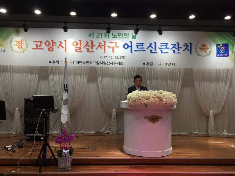 이날 행사는 일산서구 관내 경로당 회장 등 어르신 400여 명이 참여한 가운데 오전 9시 50분부터 진행됐다. 색소폰 공연, 민요가락 등으로 시작한 식전행사 공연이 1시간가량 펼쳐졌으며 공식행사로 국민의례, 노인 강령 낭독과 노인복지기여자에 대한 시상 및 사진촬영, 일산서구지회장의 기념사와 내빈들의 축사가 이어졌다.