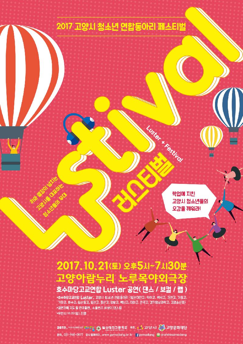 [미디어타임즈= 이옥수 기자] 고양문화재단 생활문화센터와 일산대진고등학교는 오는 21일(토) 오후 5시부터 7시 30분까지 고양아람누리 노루목야외극장에서 2017 고양시 청소년 연합동아리 축제 ‘러스티벌(Lustival)'을 개최한다.
