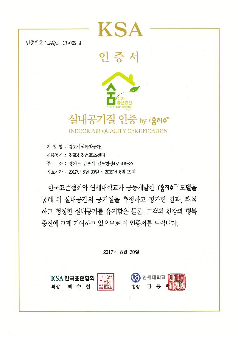 [미디어타임즈= 이옥수 기자] 김포시시설관리공단(이사장 조성범)이 운영하는 김포한강스포츠센터는 김포지역 스포츠시설 최초로 한국표준협회(KSA)가 시행하는‘실내 공기질 인증 by 아이(i)숨지수’를 획득해 숨쉬기 좋은 공간으로 인증 받았다고 16일 밝혔다.