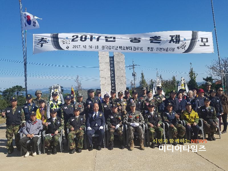 [미디어타임즈=문상수 기자] 한국유격군 백호부대 전우회(회장 조학성)는 옹진군 백령면 진촌리에 위치한 반공 유격군 전적비에서 김창원 백령면장, 박관영 해병6여단 참모장, 주민 및 전우회 회원 등 50여명이 참석한 가운데 백호부대 전우회 참전(충혼)기념 행사를 지난 17일에 가졌다.행사에 참여한 한국유격군 백호부대 전우회 소속 회원 50여 명은 한국유격군 백호부대 전우회에 대한 경과 보고와 추념행사를 가졌고, 행사가 진행하는 동안 6.25 전쟁 당시 백령도와 황해도를 오가며 생과 사를 넘나들던 그 시절을 회상하며 전우들의 넋을 기렸다. 조학성 회장은 “나라를 위해 목숨까지 내놓고 전장에서 혁혁한 공을 세우신 한국유격군 백호부대 전우들을 잊지 않고 행사를 지원해주시는 백령면민과 해병6여단 장병들께 감사를 표한다”라고 말했다.