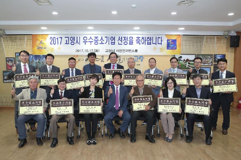 [미디어타임즈= 이옥수 기자] 고양시(시장 최성)는 지난 시청 시민컨퍼런스룸에서 2017년도 고양시 우수중소기업으로 선정된 18개 기업 대표들에게 인증서와 현판을 수여했다.