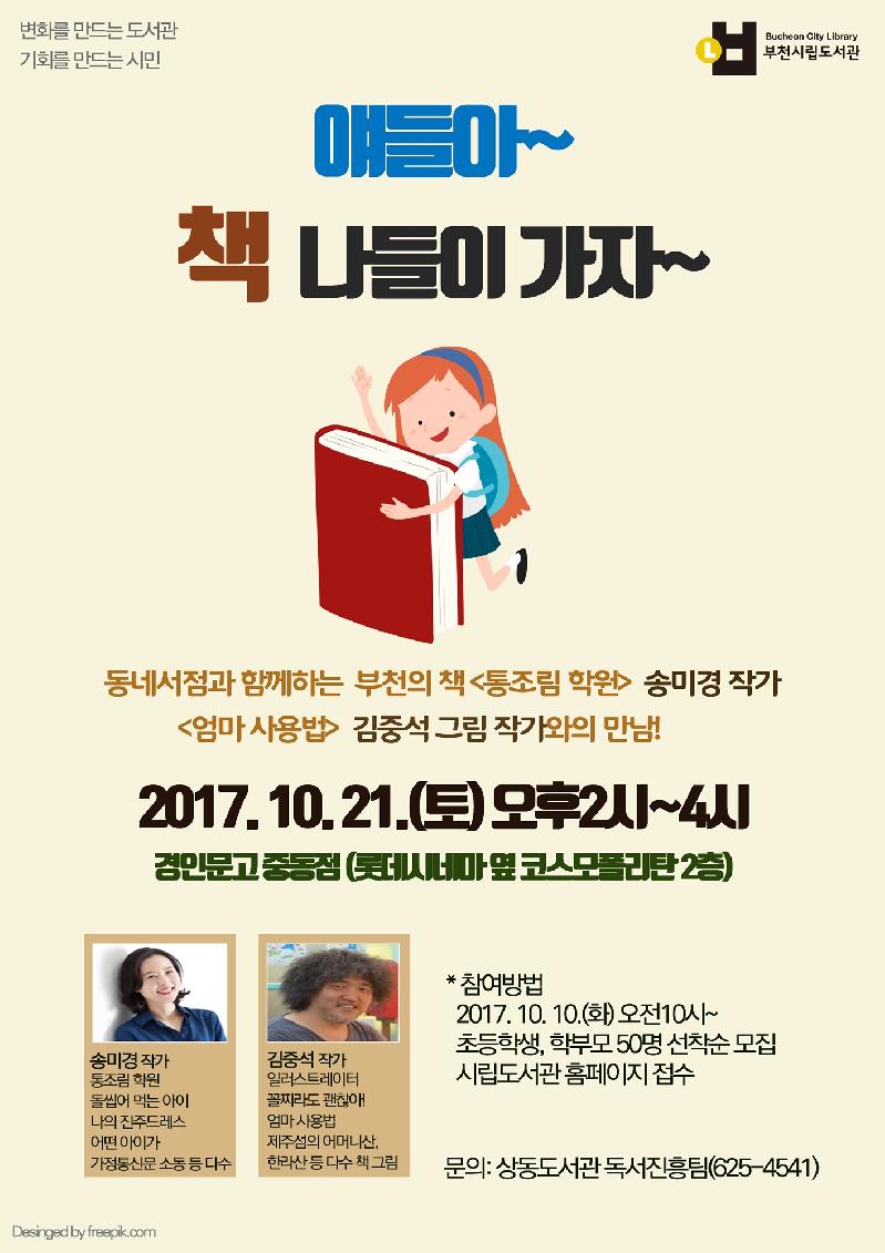 참여를 원하는 시민은 부천시립도서관 홈페이지(www.bcl.go.kr)에서 신청하면 되고 당일 선착순 입장도 가능하다. 자세한 사항은 상동도서관 독서진흥팀(032-625-4541)으로 문의하면 된다.
