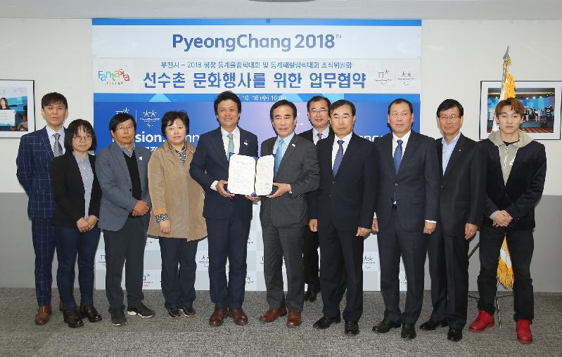 부천시는 평창 동계올림픽대회 및 동계패럴림픽대회의 성공적인 개최를 위해 18일(수) 2018년 평창 동계올림픽대회 및 동계패럴림픽대회 조직위원회(위원장 이희범)와 ‘선수촌 문화 행사 운영을 위한 업무협약’을 체결했다.