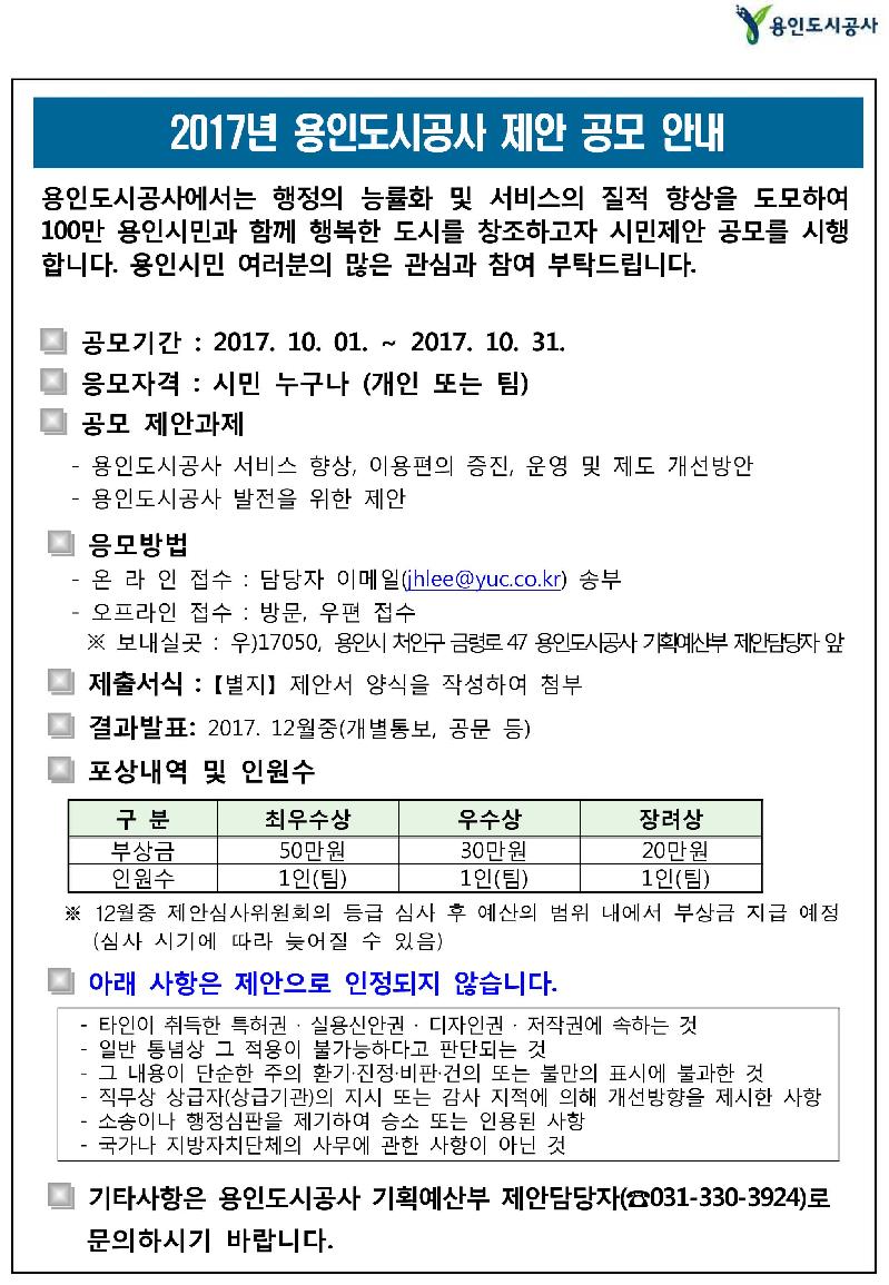 접수는 용인도시공사 홈페이지(www.yuc.co.kr)에서 양식을 받아 방문, 우편, 전자우편(jhlee@yuc.co.kr)으로 하면 된다. 2인 이상 공동제안도 가능하다.