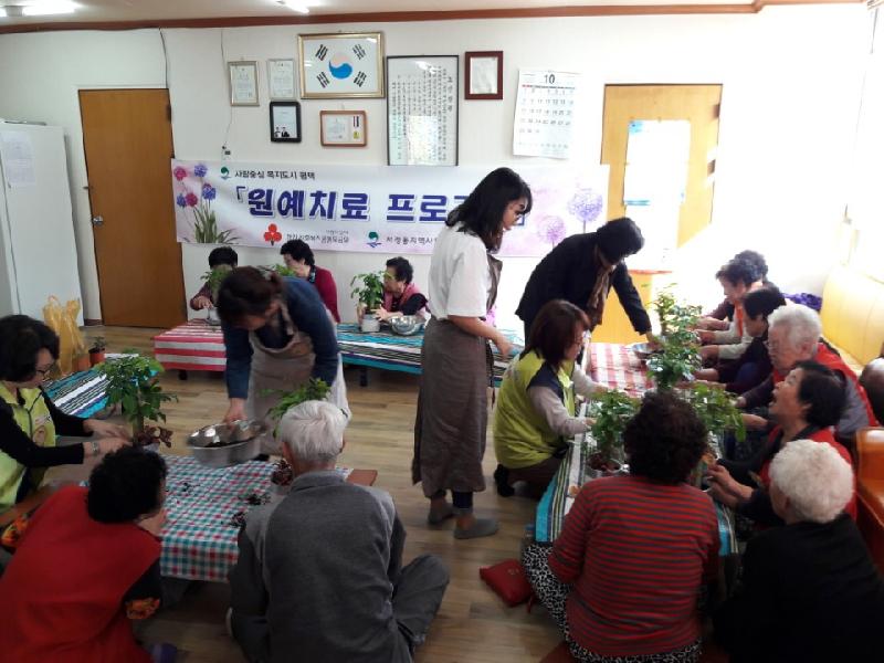 [미디어타임즈= 이옥수 기자] 평택시 서정동 지역사회보장협의체(민간위원장 김인숙)에서는 17일 저소득계층 어르신 20명을 대상으로 신창경로당(회장 주진학)에서 원예치료 프로그램을 진행했다.