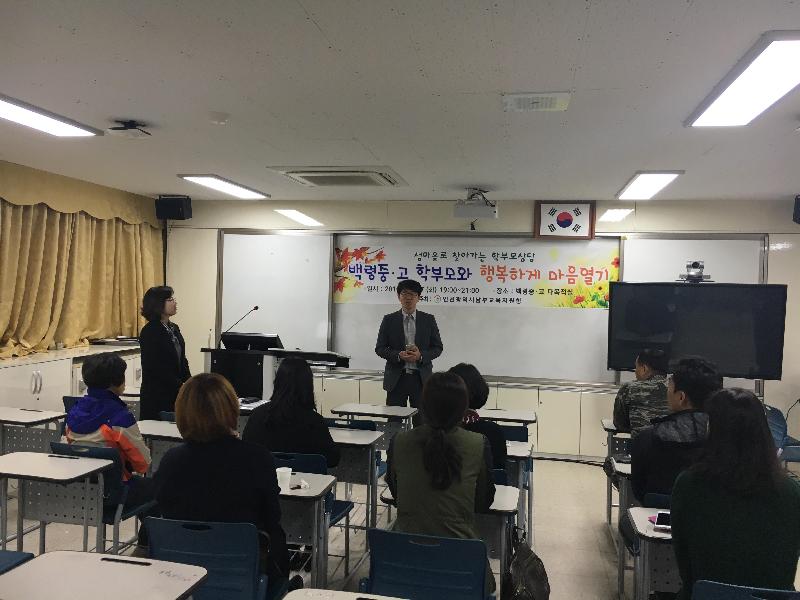 [미디어타임즈= 김광한 기자] 인천남부교육지원청(교육장 공덕환)은 17(화) ~ 18.(수) 백령중·고 다목적실에서 그 동안 학부모지원에 소외되었던 백령중·고 학부모를 대상으로 개인상담과 집단상담을 실시하여 큰 호응을 얻었다.