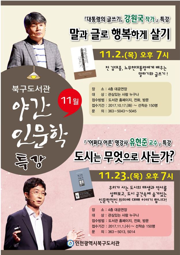 [미디어타임즈= 김광한 기자] 인천광역시북구도서관(관장 윤예원)은 11월, 인천 시민을 대상으로 야간 인문학 특강을 마련하고 참여 학습자를 모집한다.
