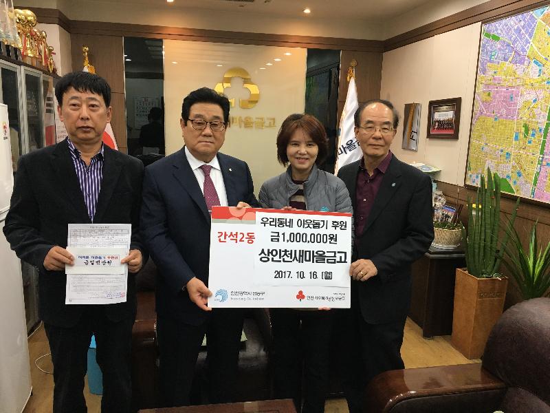 [미디어타임즈= 김광한 기자] 인천 남동구 간석2동(동장 성길순)은 상인천 새마을금고(이사장 채익희)가 지난 16일 어려운 이웃돕기 후원금 100만원을 지정 기탁했다고 밝혔다.