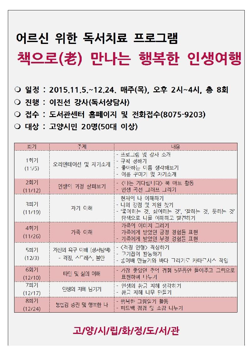 고양시(시장 최성) 덕양구 화정도서관에서는 오는 11월 5일부터 12월 24일까지 매주 목요일 총 8회에 걸쳐 어르신을 위한 독서치료 프로그램 ‘책으로(老) 만나는 행복한 인생여행‘을 진행한다고 밝혔다.