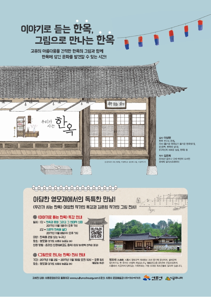 [미디어타임즈= 이옥수 기자] 시흥시(시장 김윤식)는 오는 11월, 향토유적 제4호 영모재(시흥시 능골길 26)에서 한옥 특강&전시 '이야기로 듣는 한옥, 그림으로 만나는 한옥'을 개최한다.