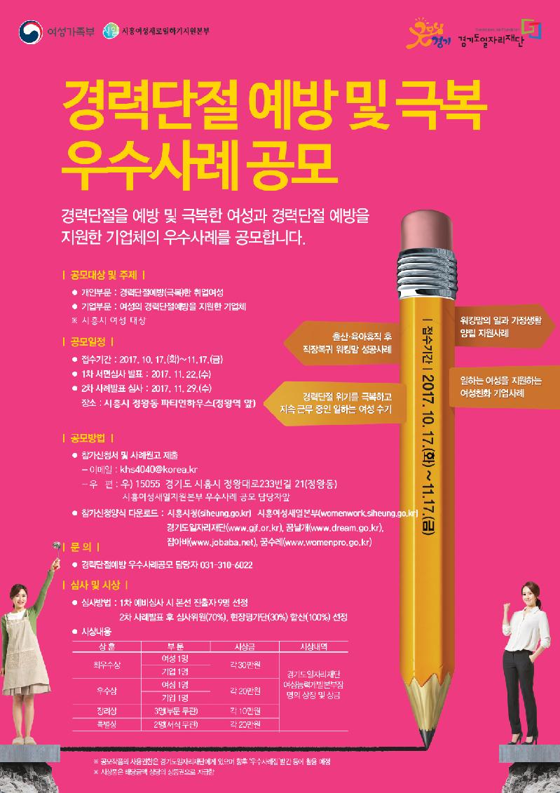 공모사례의 주제는 ‘경력단절을 예방(극복)한 취업성공기’, ‘출산·육아휴직 후 직장복귀 성공사례’, ‘경력단절 없이 지속 근무 중인 여성 수기사례’, ‘경력단절예방을 위한 여성친화기업 사례’, ‘경력단절 예방 우수 지원 및 제도 사례’, ‘여성취업지원기관(시흥여성새일지원본부)의 사업 참여를 통해 경력단절 예방 성공 수기’로 기업과 개인을 나누어 시상한다.