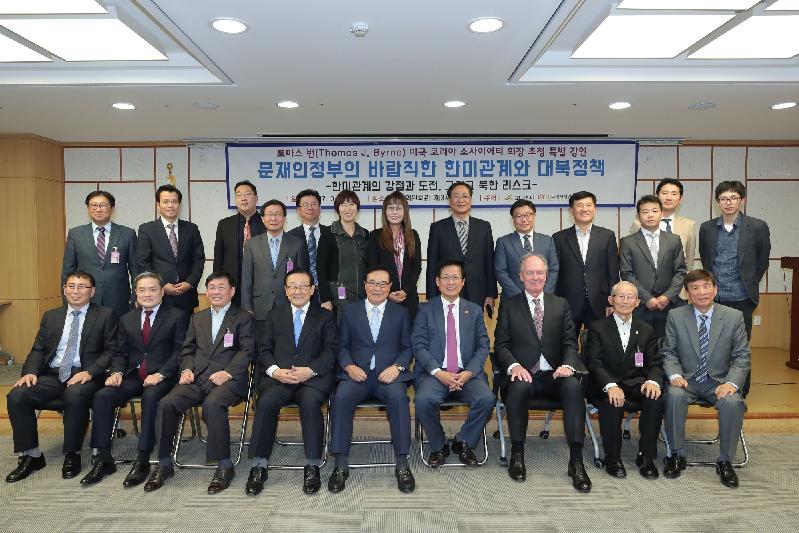 북핵 위협과 관련해서는 “한미 협력은 비핵화의 핵심적 요소”라고 언급한 뒤 “전략적 인내 보다는 문재인, 트럼프 정부가 북한 문제에 대한 긴급성을 갖고 압박과 협상요구를 병행해야 한다”고 했다. 이어 “가장 강력한 방어선은 미국과의 연합과 상호 방어조약을 통한 제지”라며 그 과정에서 “코리아 소사이어티는 견고한 한미동맹 강화의 가교 역할을 담당할 것”이라고 강조했다.