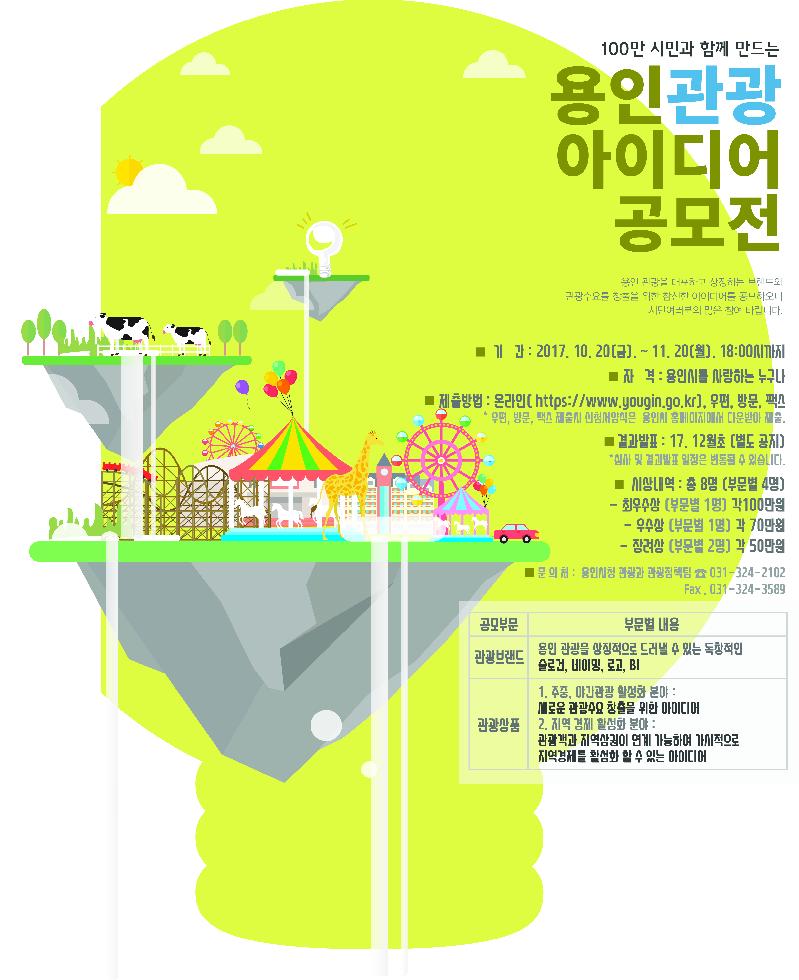 [미디어타임즈= 이옥수 기자] 용인시는 관광 분야의 창의적인 아이디어를 발굴하기 위해 오는 20일(금)~11월20일(월)까지 전 국민을 대상으로 ‘관광 아이디어 공모전’을 실시키로 했다고 밝혔다.